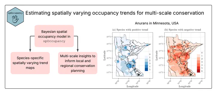 Check out our new paper showcasing a new method for estimating spatially varying occupancy trends within spOccupancy. We apply the framework to inform monitoring and conservation assessments of 11 anuran species in Minnesota, USA. See the paper here for more details.