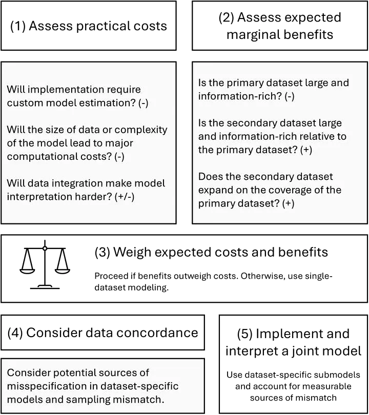A new paper led by Ben Goldstein provides guidance to practitioners on when to use data integration for a species distribution modeling application. We provide a variety of practical considerations for researchers, students, and practitioners to consider the pros and cons of data integration. See the paper here for more details.