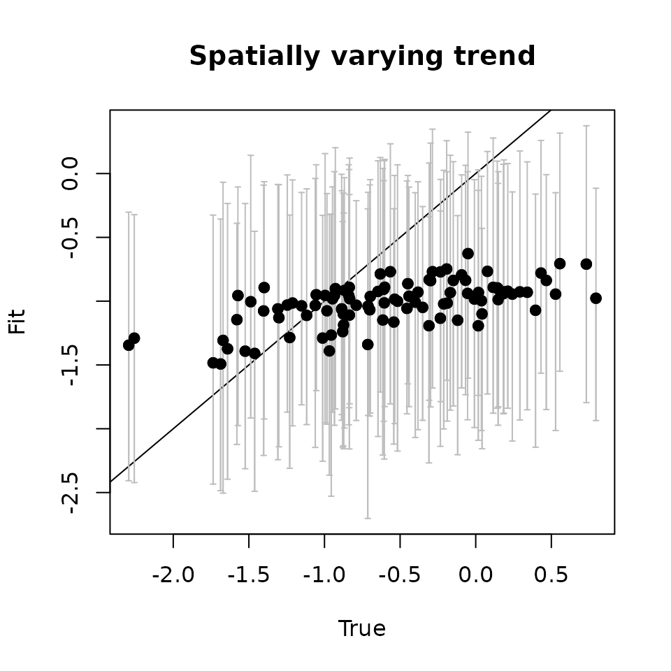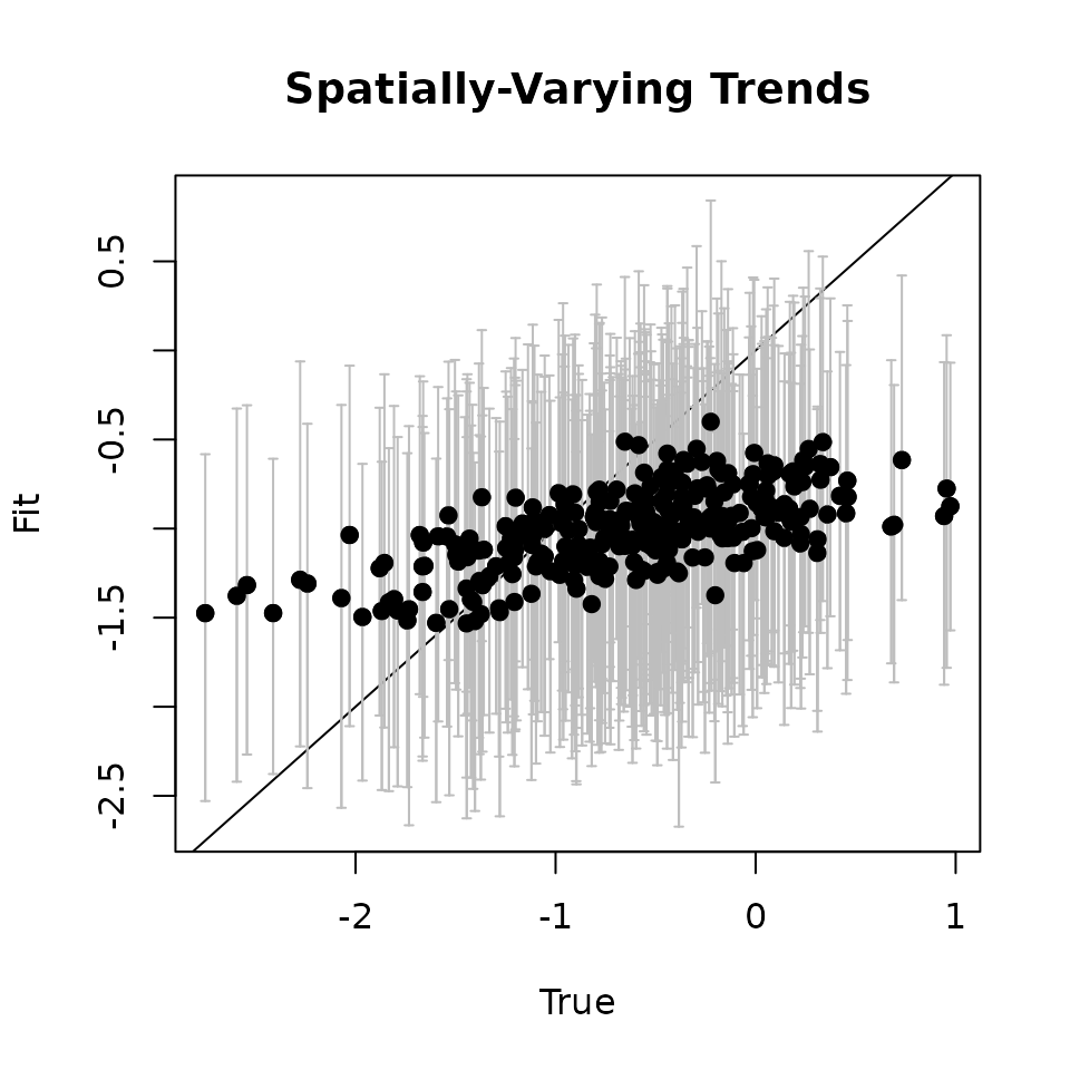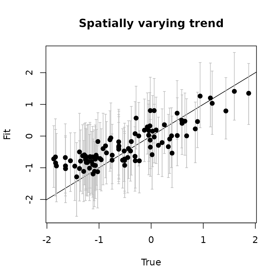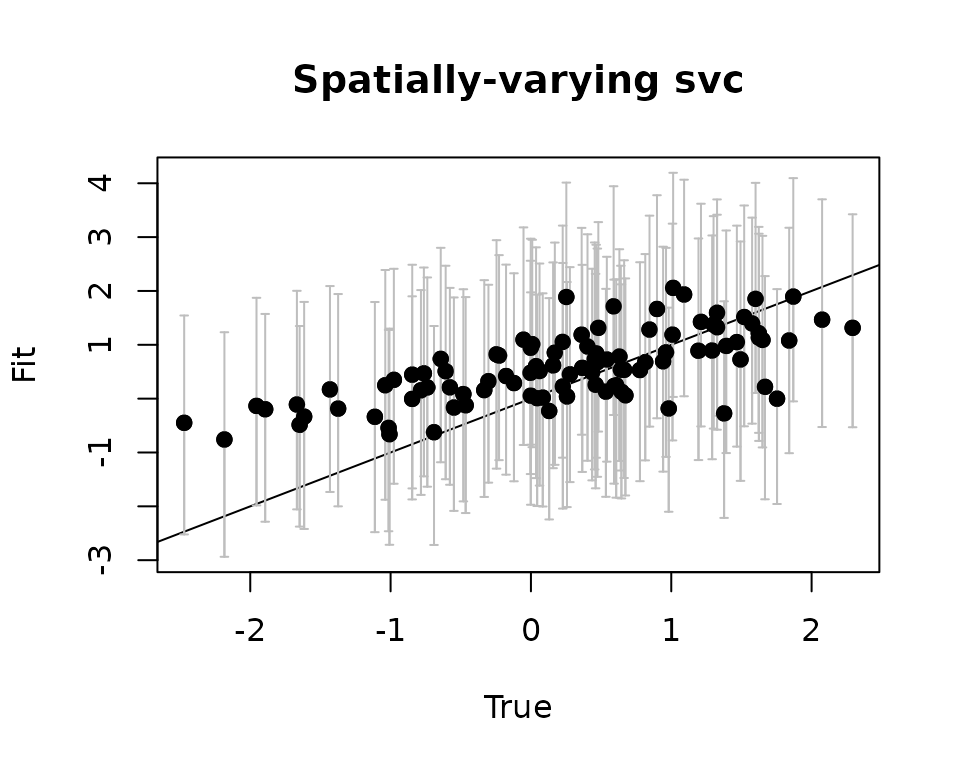 xlab = "True", ylab = "Fit", main = 'Spatially-varying svc')