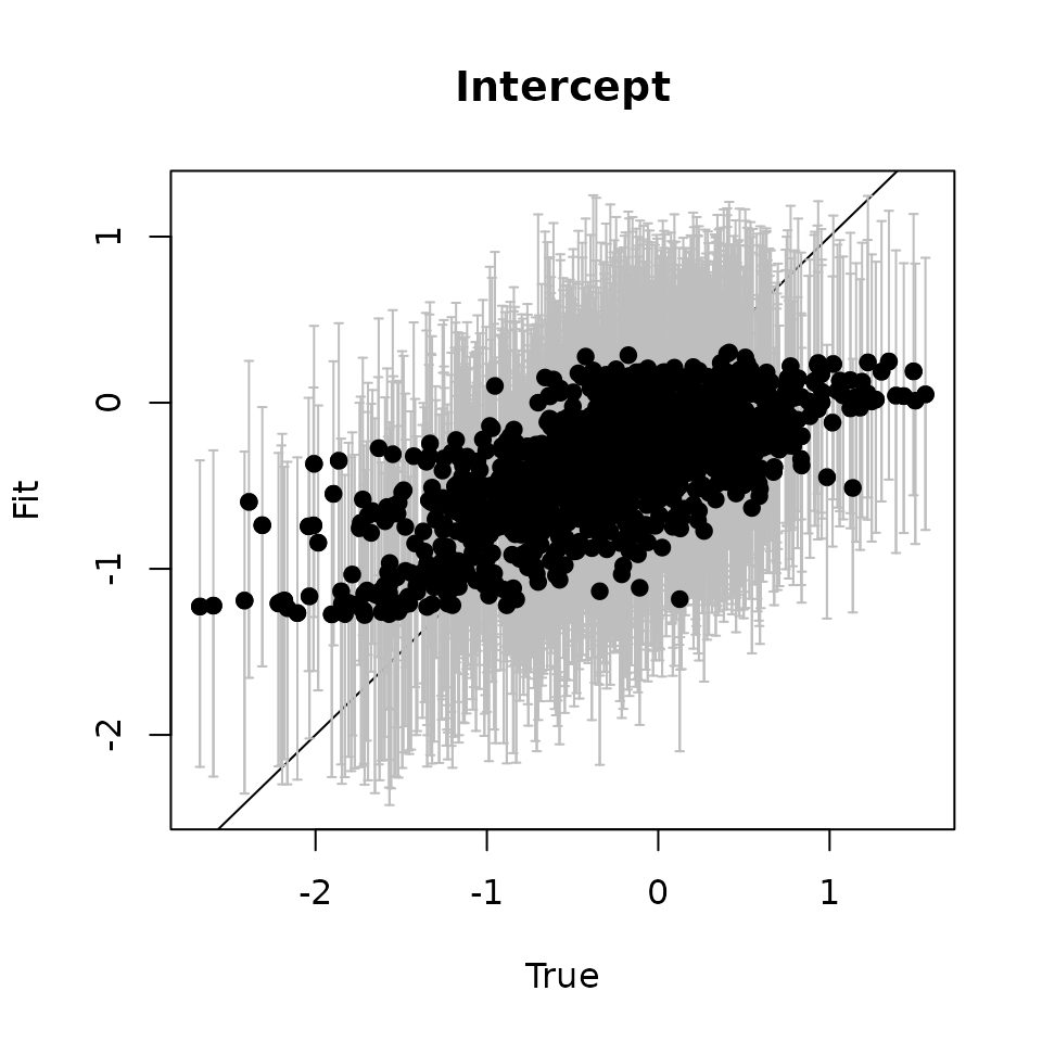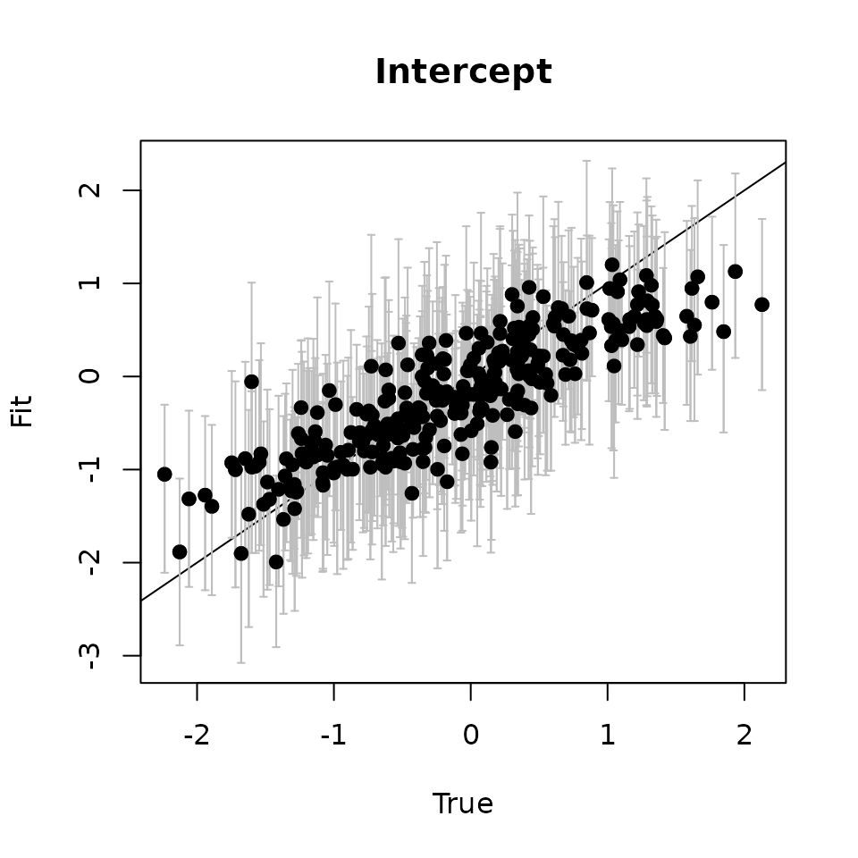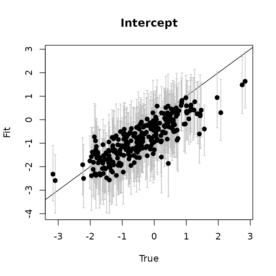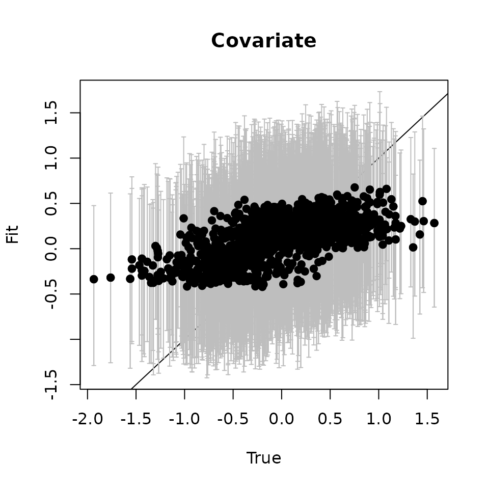 xlab = "True", ylab = "Fit", main = 'Spatially-varying svc')