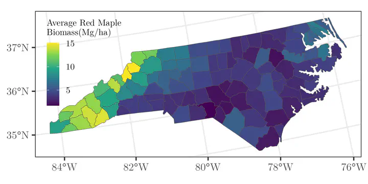 With collaborators at Michigan State University and the US Forest Service, we are developing multivariate spatial Bayesian models to generate improved estimates of forest parameters by species or species group. Our unit-level model-based approach shares information across space and across species groups to improve the precision of forest biomass estimates within user-defined areal regions of interest (e.g., counties, ownership blocks).